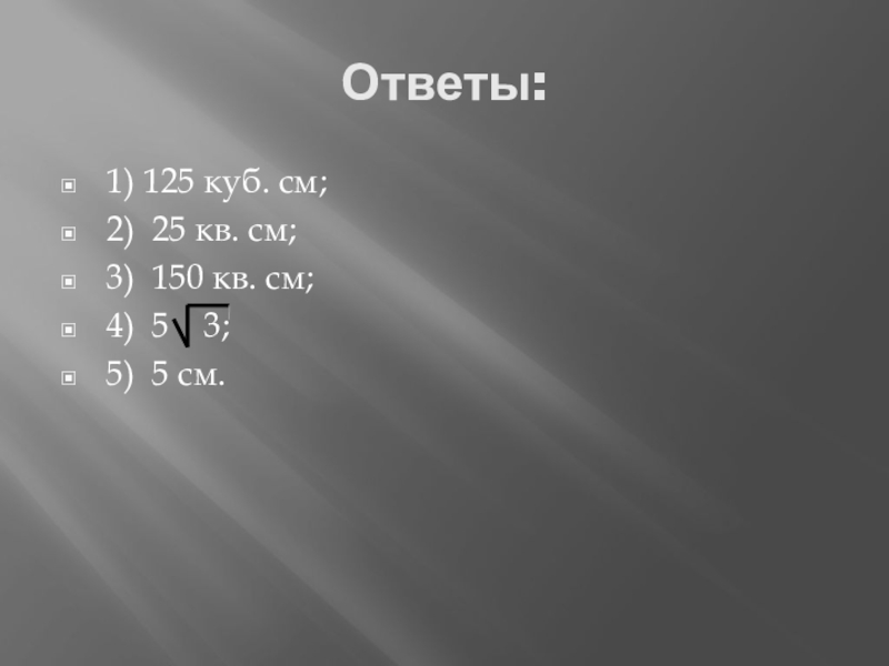 Ответы:1) 125 куб. см;2) 25 кв. см;3) 150 кв. см;4) 5  3;5) 5 см.