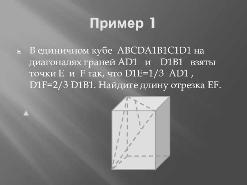 Пример 1В единичном кубе ABCDA1B1C1D1 на диагоналях граней AD1  и  D1B1  взяты точки E