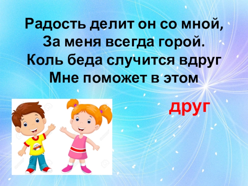 Слайд 5Радость делит он со мной, За меня всегда горой. Коль беда случится вдруг