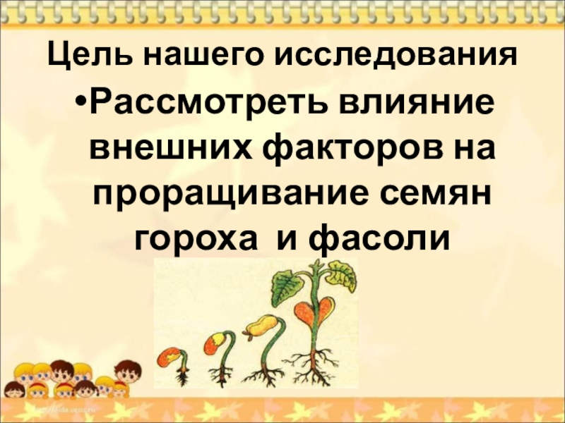 Цель нашего исследованияРассмотреть влияние внешних факторов на проращивание семян гороха и фасоли