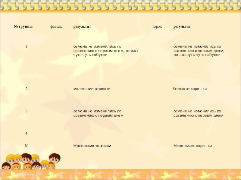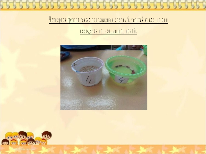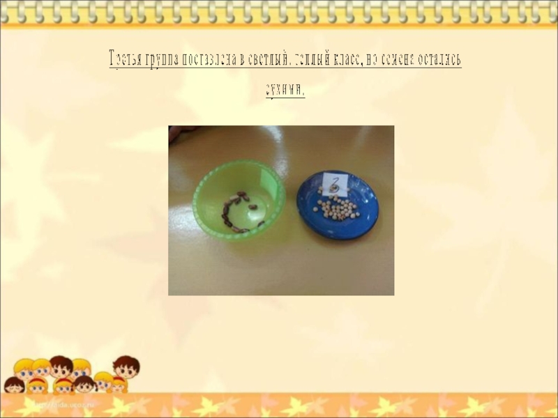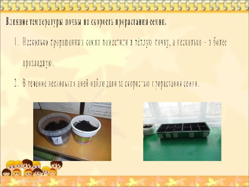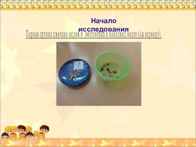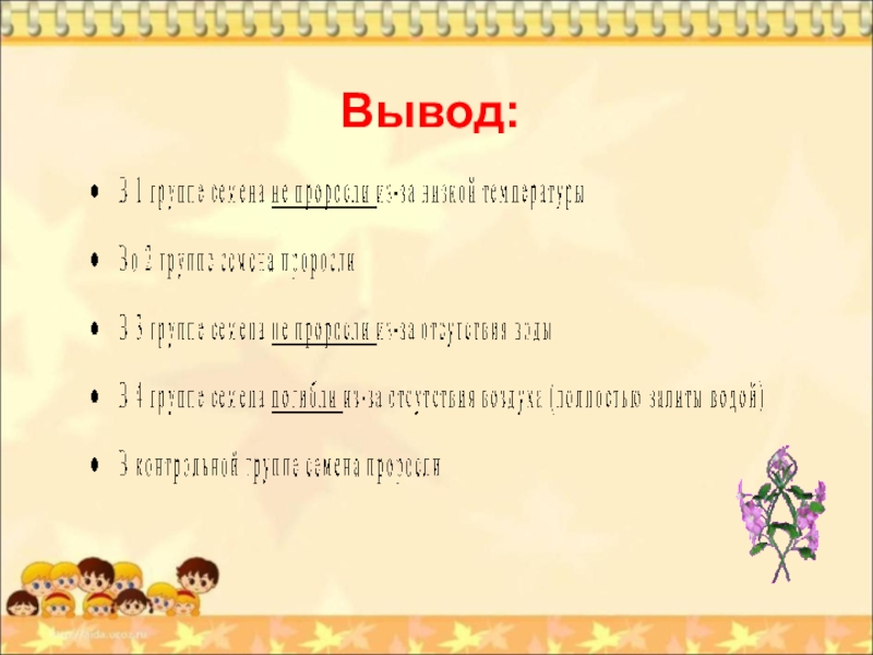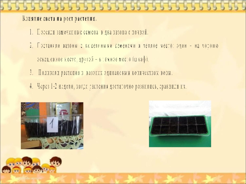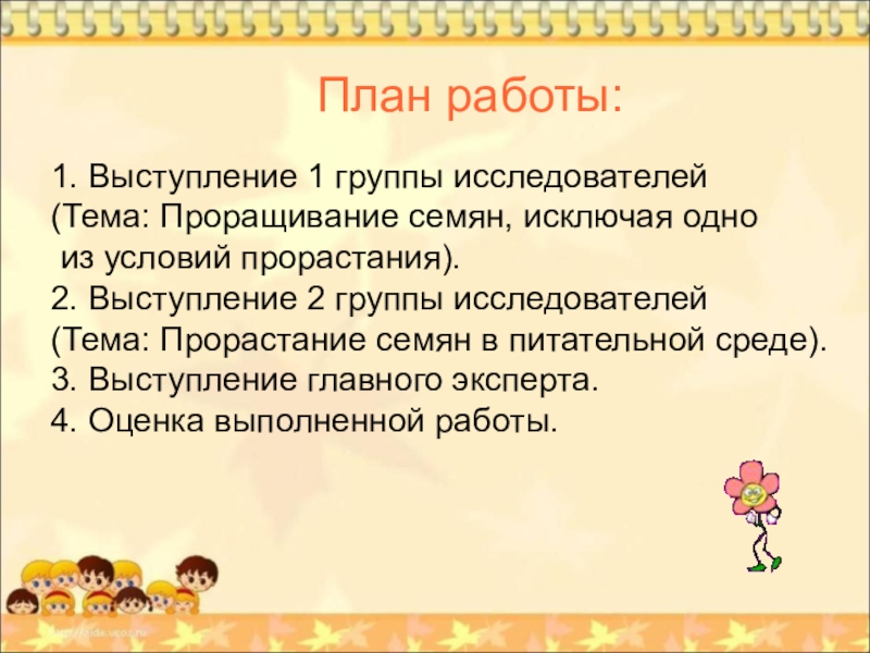 План работы:1. Выступление 1 группы исследователей (Тема: Проращивание семян, исключая одно из условий прорастания).2. Выступление 2 группы