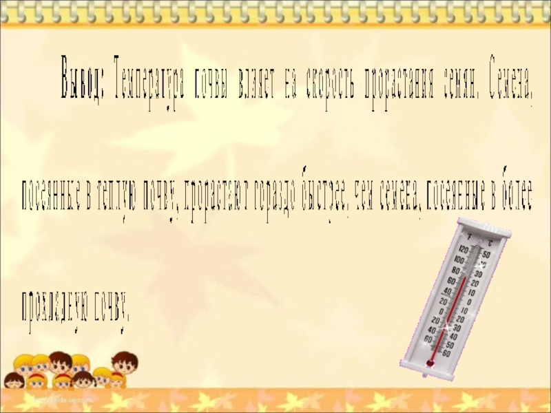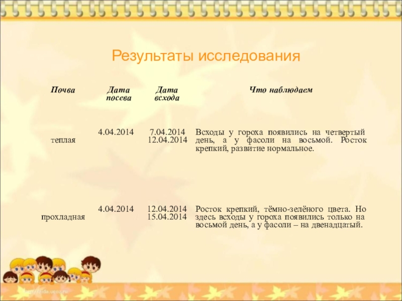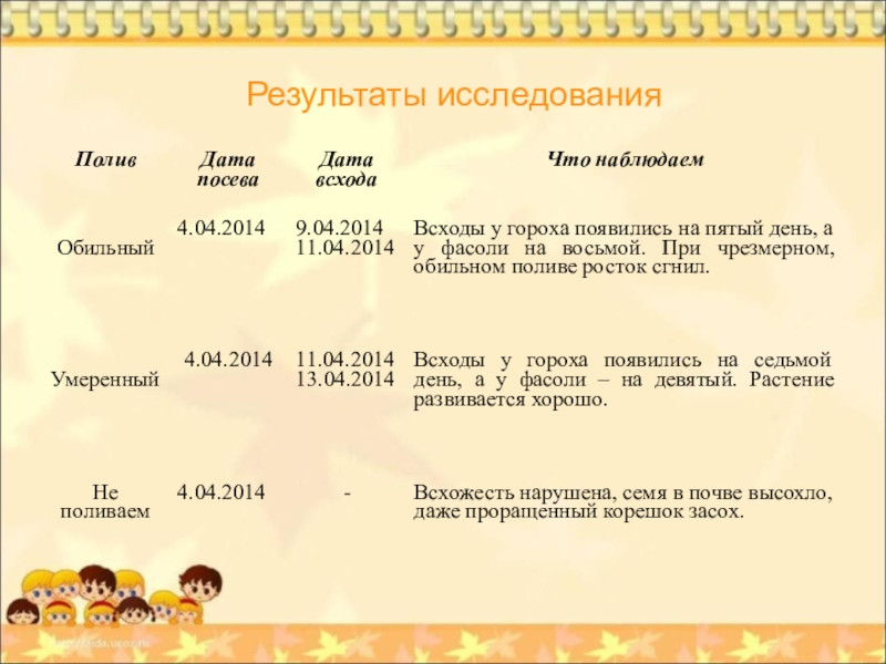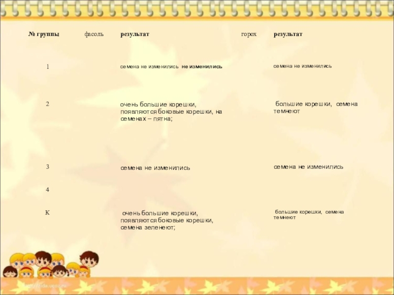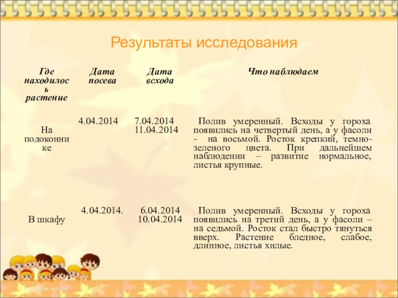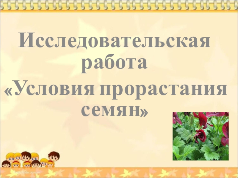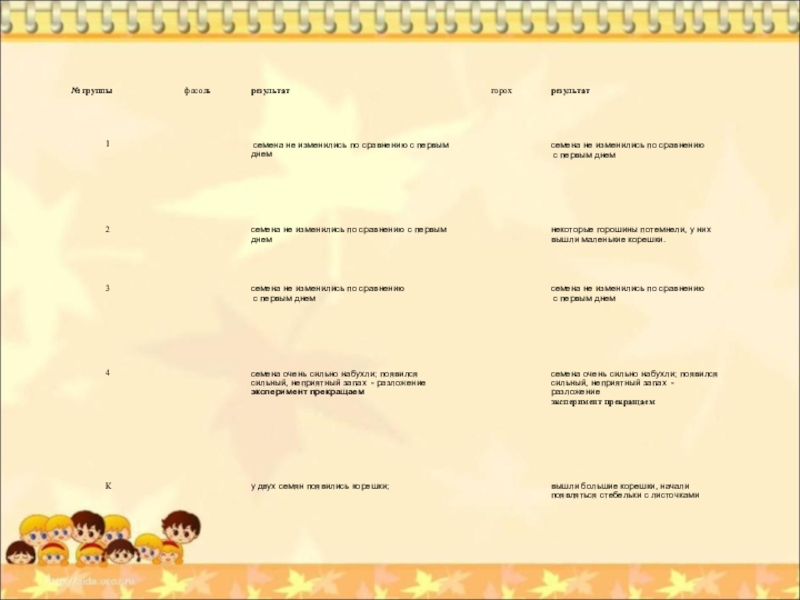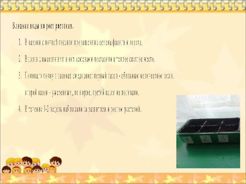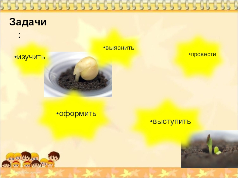 План работы:1. Выступление 1 группы исследователей (Тема: Проращивание семян, исключая одно из условий прорастания).2. Выступление 2 группы
