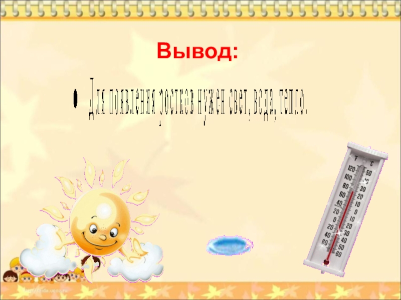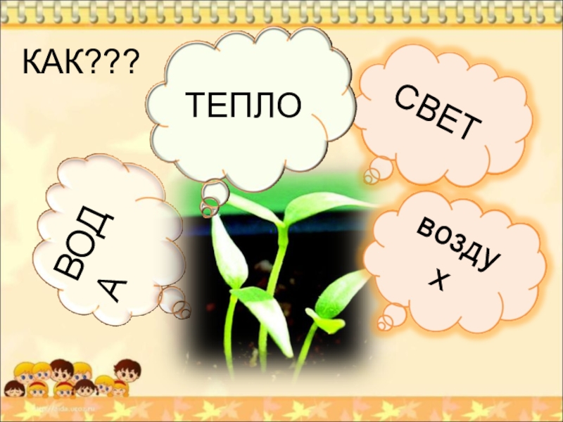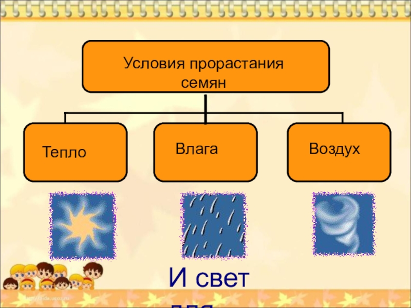 Условия прорастания семянТепло ВлагаВоздухИ свет для развития ростков