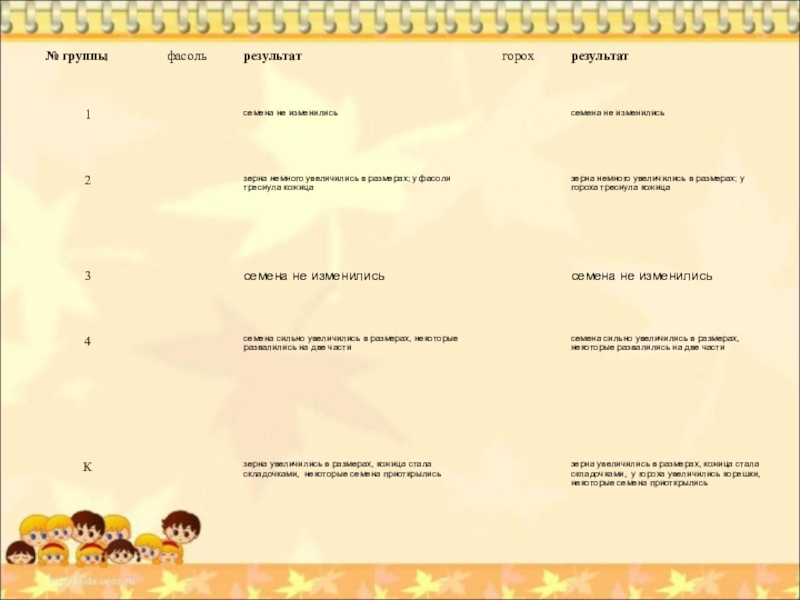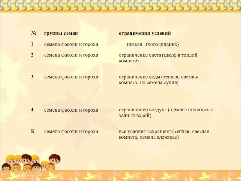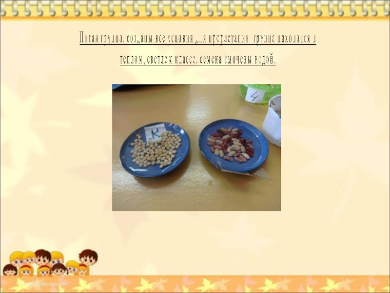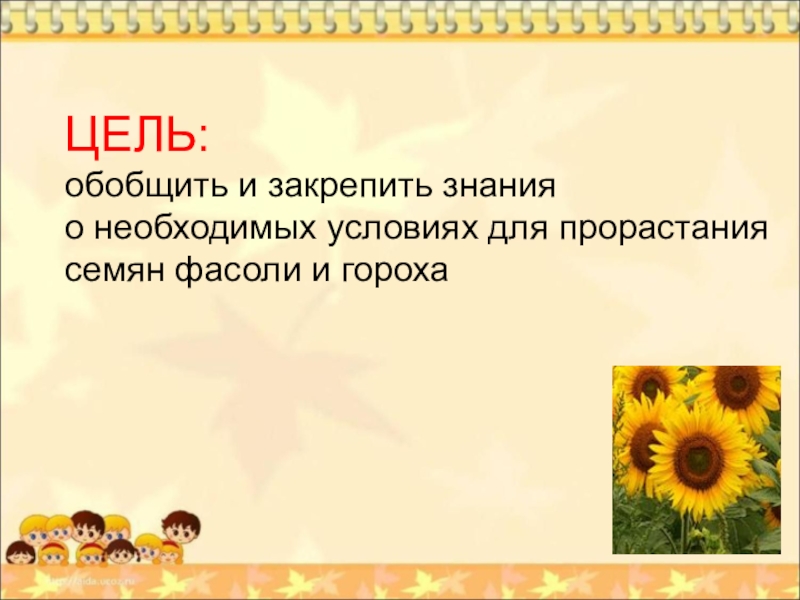 ЦЕЛЬ: обобщить и закрепить знанияо необходимых условиях для прорастания семян фасоли и гороха