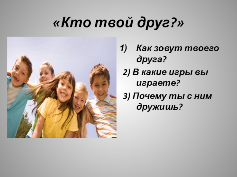 «Кто твой друг?»Как зовут твоего друга?2) В какие игры вы играете?3) Почему ты с ним дружишь?