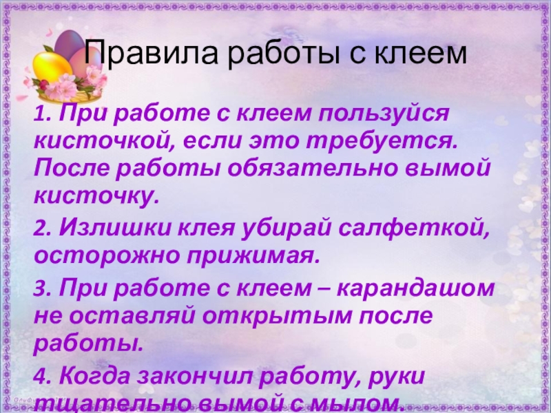 Правила работы с клеем1. При работе с клеем пользуйся кисточкой, если это требуется. После работы обязательно вымой