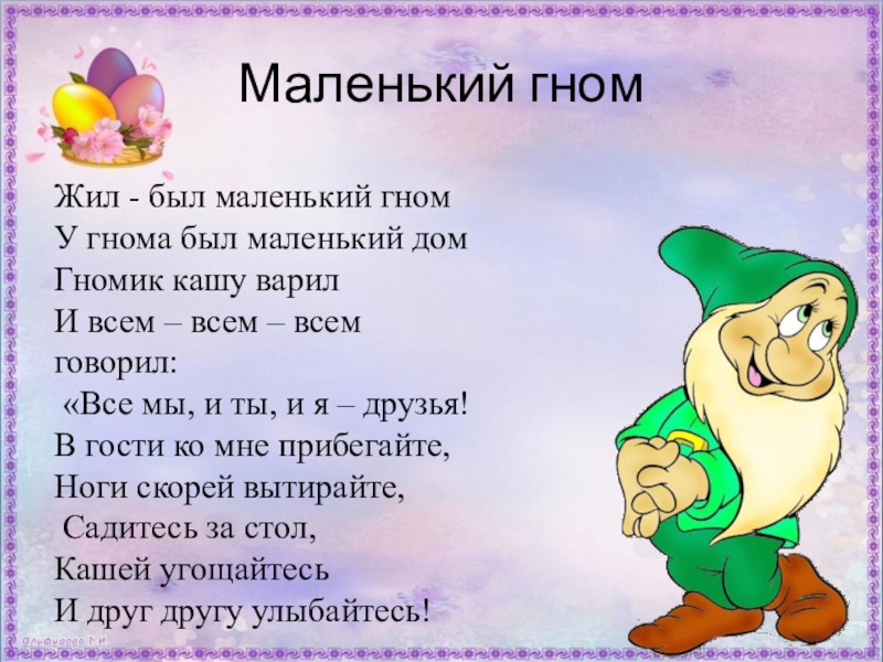 Маленький гномЖил - был маленький гном У гнома был маленький дом Гномик кашу варилИ всем – всем