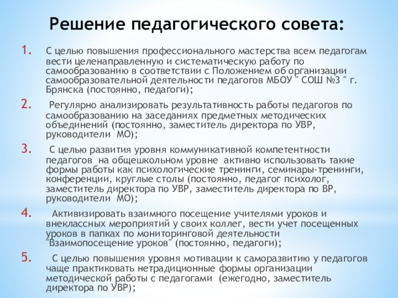 и систематическую работу по самообразованию в соответствии с Положением об организации самообразовательной деятельности педагогов МБОУ " СОШ №3 " г. Брянска (постоянно, педагоги);