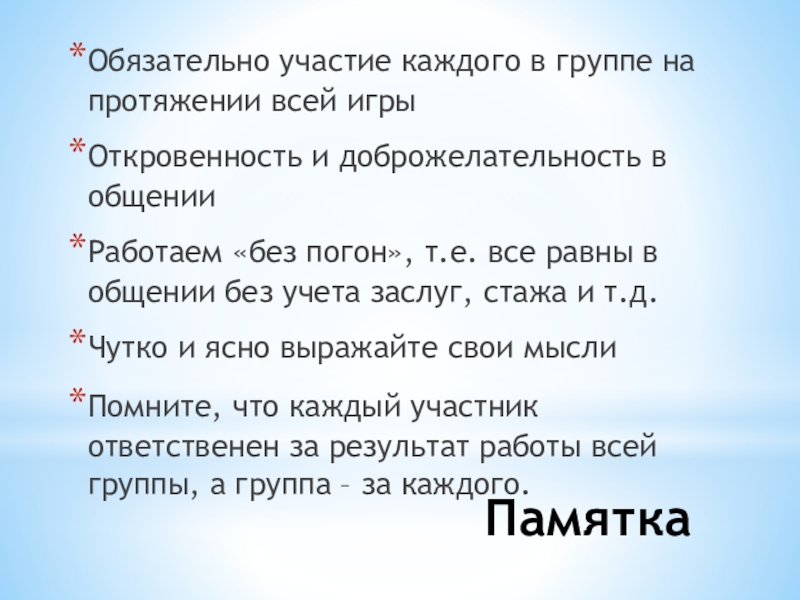 Помните, что каждый участник ответственен за результат работы всей группы, а группа – за каждого.