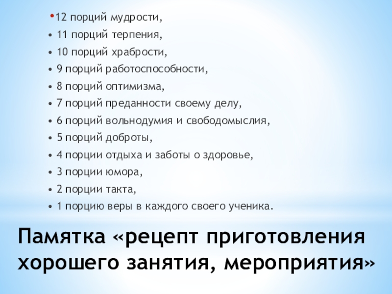 Слайд 20Памятка «рецепт приготовления хорошего занятия, мероприятия»