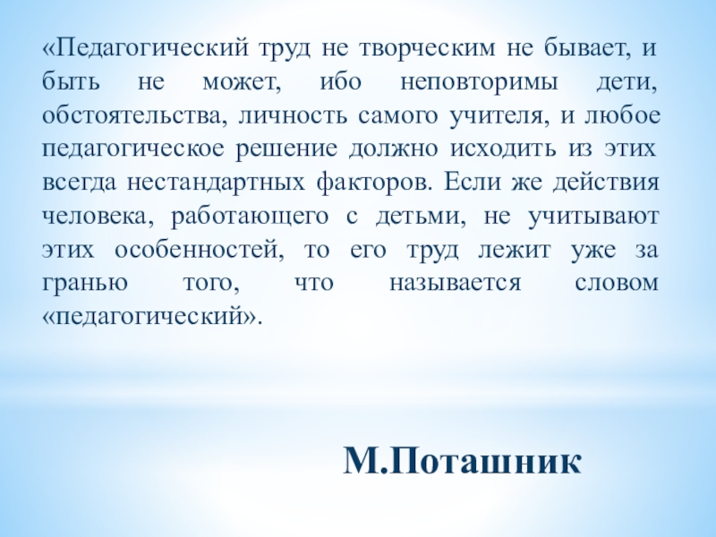 неповторимы дети, обстоятельства, личность самого учителя, и любое педагогическое решение должно исходить из этих всегда нестандартных факторов. Если же действия человека, работающего с детьми, не учитывают этих особенностей, то его труд лежит уже за гранью того, что называется словом «педагогический».