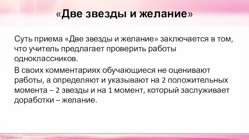 В своих комментариях обучающиеся не оценивают работы, а определяют и указывают на 2 положительных момента – 2 звезды и на 1 момент, который заслуживает доработки – желание.