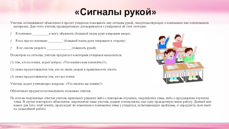 рукой, свидетельствующие о понимании или непонимании материала. Для этого учитель предварительно договаривается с учащимися об этих сигналах: