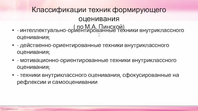 - техники внутриклассного оценивания, сфокусированные на рефлексии и самооценивании