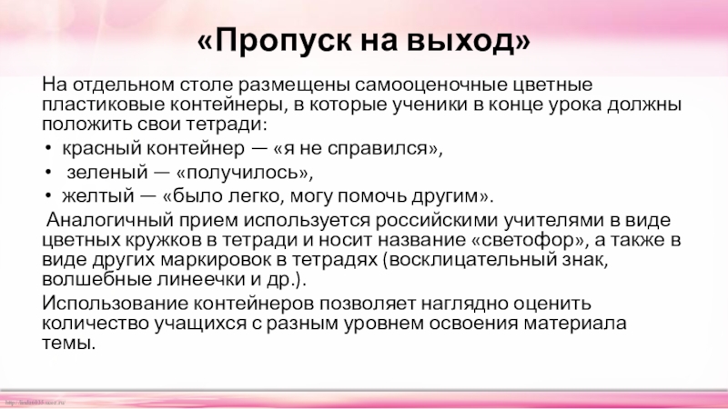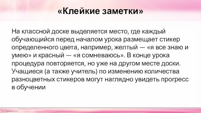началом урока размещает стикер определенного цвета, например, желтый — «я все знаю и умею» и красный — «я сомневаюсь». В конце урока процедура повторяется, но уже на другом месте доски. Учащиеся (а также учитель) по изменению количества разноцветных стикеров могут наглядно увидеть прогресс в обучении