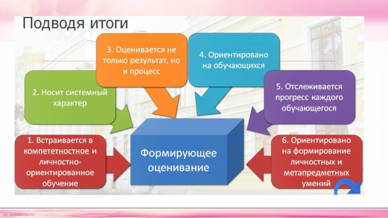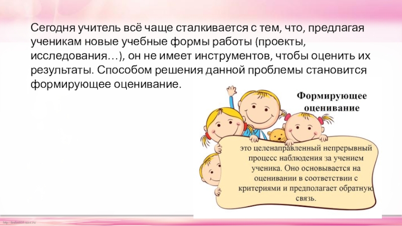 учебные формы работы (проекты, исследования…), он не имеет инструментов, чтобы оценить их результаты. Способом решения данной проблемы становится формирующее оценивание.