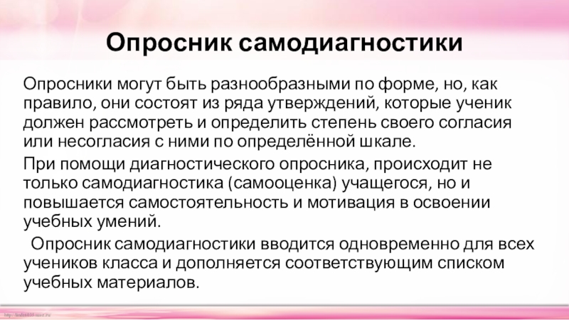 При помощи диагностического опросника, происходит не только самодиагностика (самооценка) учащегося, но и повышается самостоятельность и мотивация в освоении учебных умений.