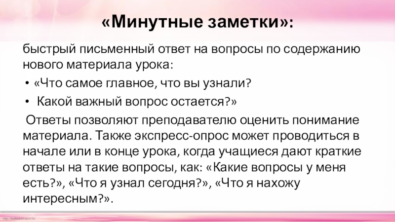 предоставления учащимся обратной связи о том, что они узнали по теме. Для написания одноминутного эссе учитель может задать следующие вопросы: