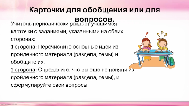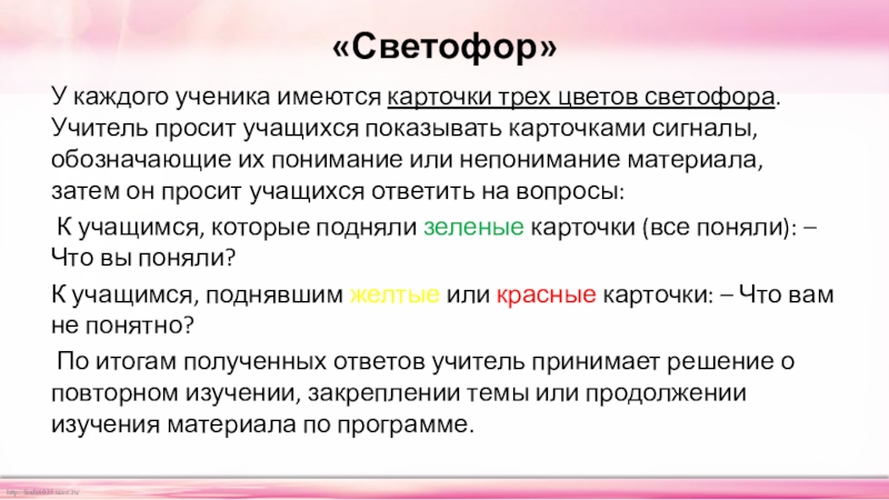 показывать карточками сигналы, обозначающие их понимание или непонимание материала, затем он просит учащихся ответить на вопросы: