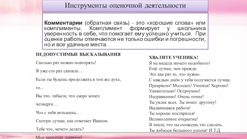 Комплимент формирует у школьника уверенность в себе, что помогает ему успешно учиться. При оценке работы отмечаются не только ошибки и погрешности, но и все удачные места.