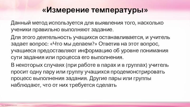 Для этого деятельность учащихся останавливается, и учитель задает вопрос: «Что мы делаем?» Ответив на этот вопрос, учащиеся предоставляют информацию об уровне понимания сути задания или процесса его выполнения.