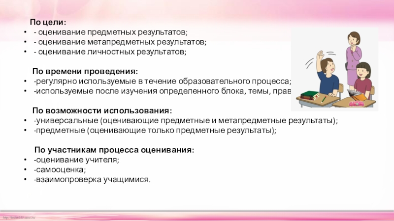 3) Включающая самого ученика в процесс оценивания (с целью повышения мотивации и самостоятельности учащегося);
