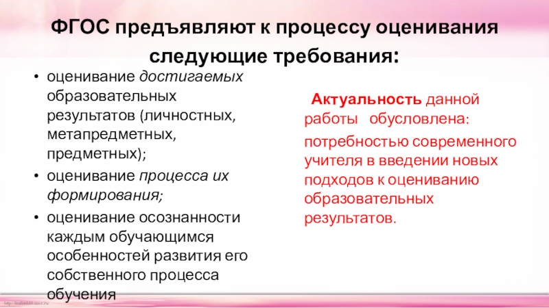 Слайд 4ФГОС предъявляют к процессу оценивания следующие требования: