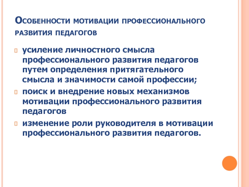 Мотивация профессионального развития – процесс побуждения педагога к активной педагогической деятельности, направленной на получение нового качественного результата и сфокусированной на достижении личного смысла в профессии.