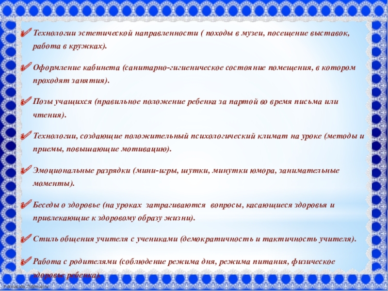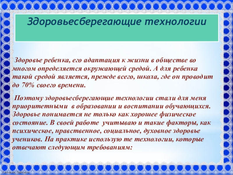 Поэтому здоровьесберегающие технологии стали для меня приоритетными в образовании и воспитании обучающихся. Здоровье понимается не только как хорошее физическое состояние. В своей работе учитываю и такие факторы, как психическое, нравственное, социальное, духовное здоровье учеников. На практике использую те технологии, которые отвечают следующим требованиям: