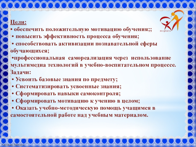 •профессиональная самореализация через использование мультимедиа технологий в учебно-воспитательном процессе.