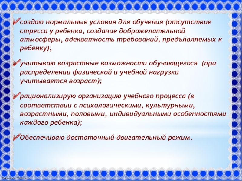 Слайд 17создаю нормальные условия для обучения (отсутствие стресса у ребенка, создание доброжелательной