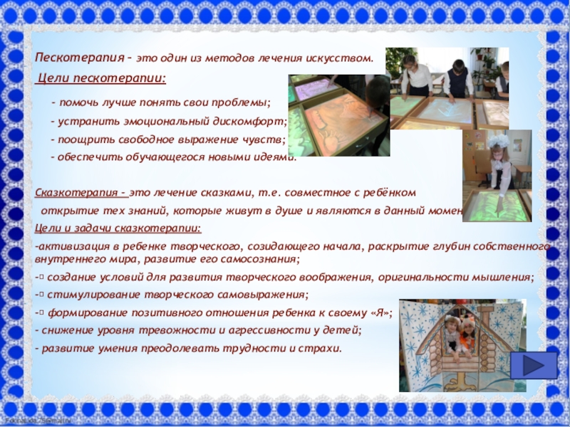 Слайд 23Пескотерапия – это один из методов лечения искусством.
