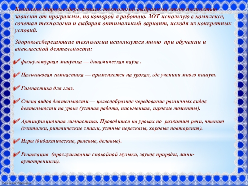 Слайд 18Комплекс здоровьесберегающих технологий выбранный мною полностью зависит от программы, по которой