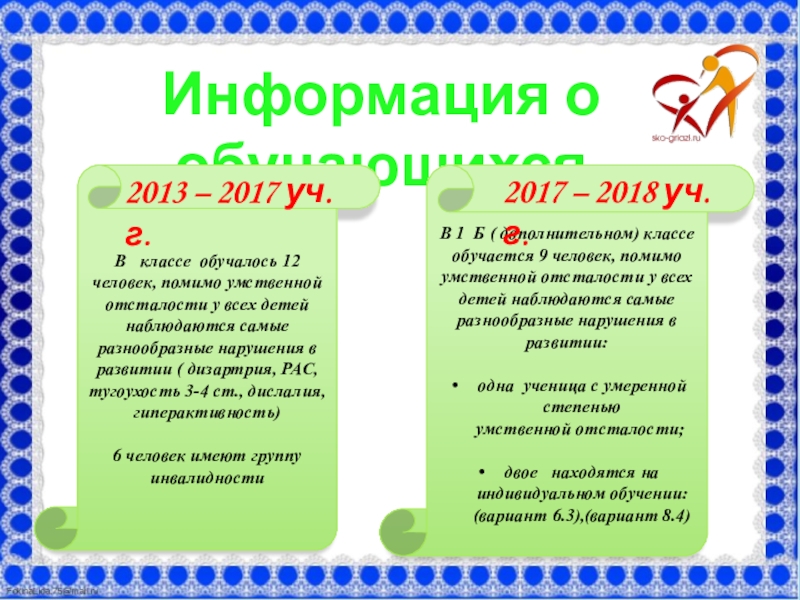 В 1 Б ( дополнительном) классе обучается 9 человек, помимо умственной отсталости у всех детей наблюдаются самые разнообразные нарушения в развитии: