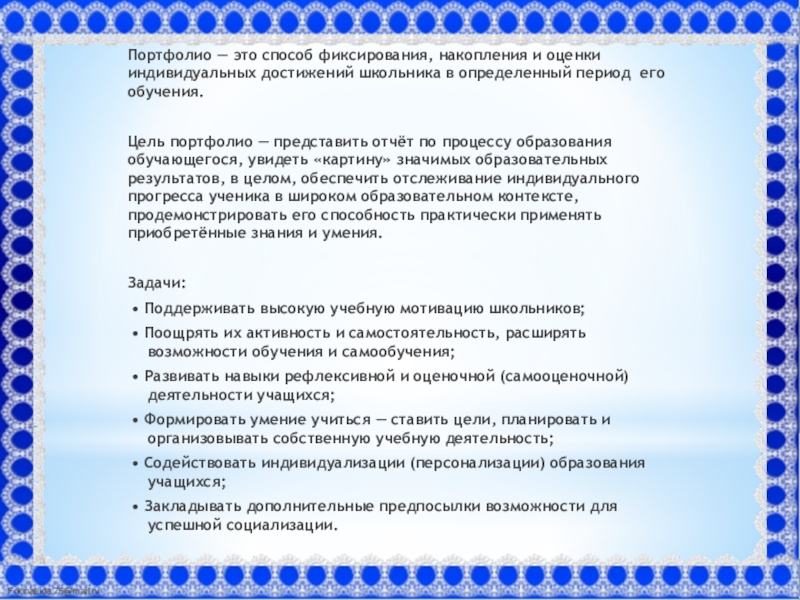 Слайд 24Портфолио — это способ фиксирования, накопления и оценки индивидуальных достижений школьника в