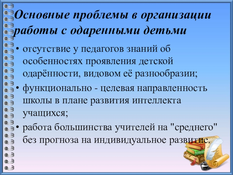 Слайд 8Основные проблемы в организации работы с одаренными детьми