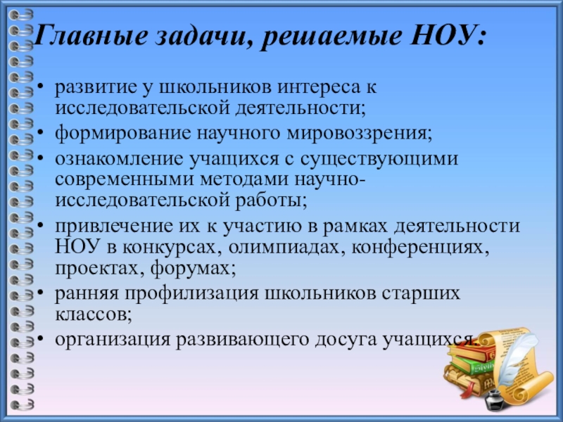 Слайд 14Главные задачи, решаемые НОУ:
