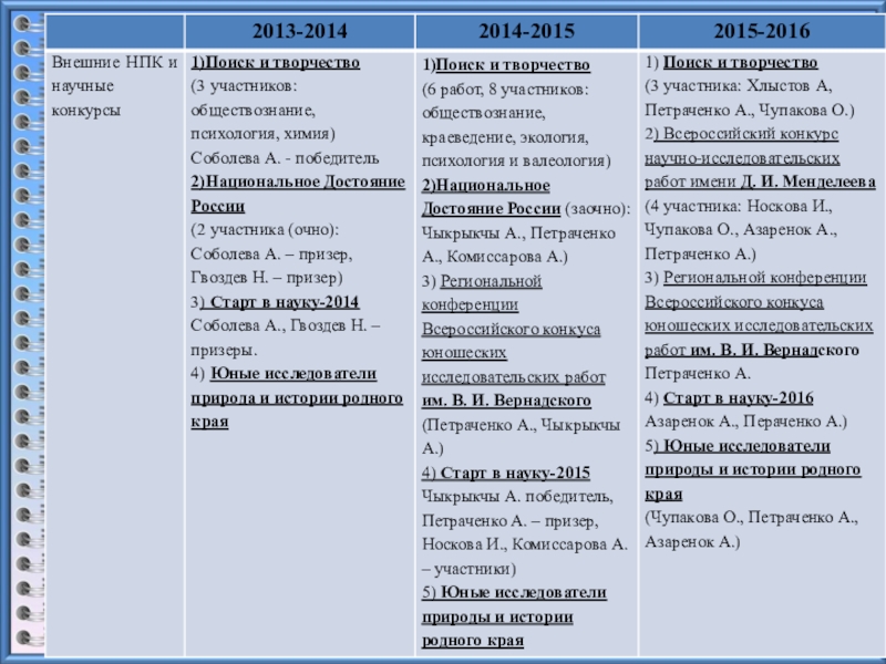 научно-исследовательских работ, творческих конкурсов, спортивных соревнований.