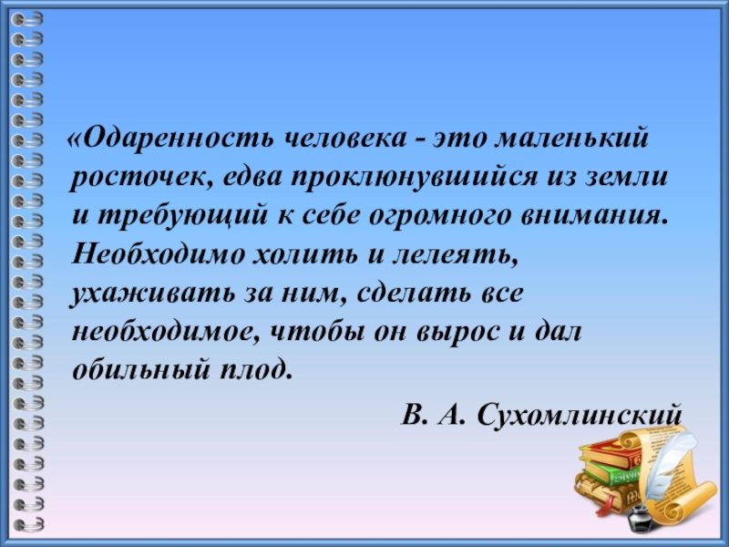 Слайд 2 «Одаренность человека - это маленький росточек, едва проклюнувшийся из