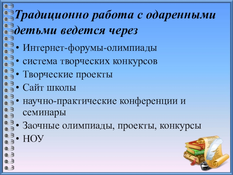 Слайд 9Традиционно работа с одаренными детьми ведется через