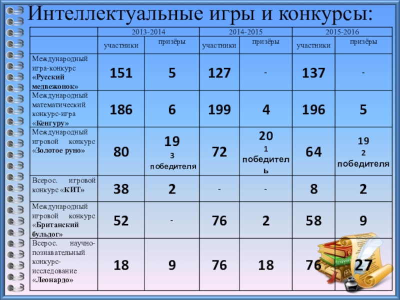 Слайд 19Интеллектуальные игры и конкурсы: