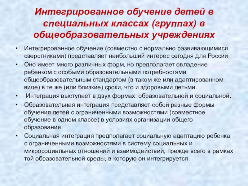 Образовательная интеграция представляет собой разные формы обучения детей с ограниченными возможностями (совместное обучение в одном классе) в условиях организации общего образования.