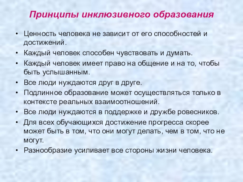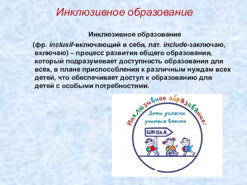 процесс развития общего образования, который подразумевает доступность образования для всех, в плане приспособления к различным нуждам всех детей, что обеспечивает доступ к образованию для детей с особыми потребностями.