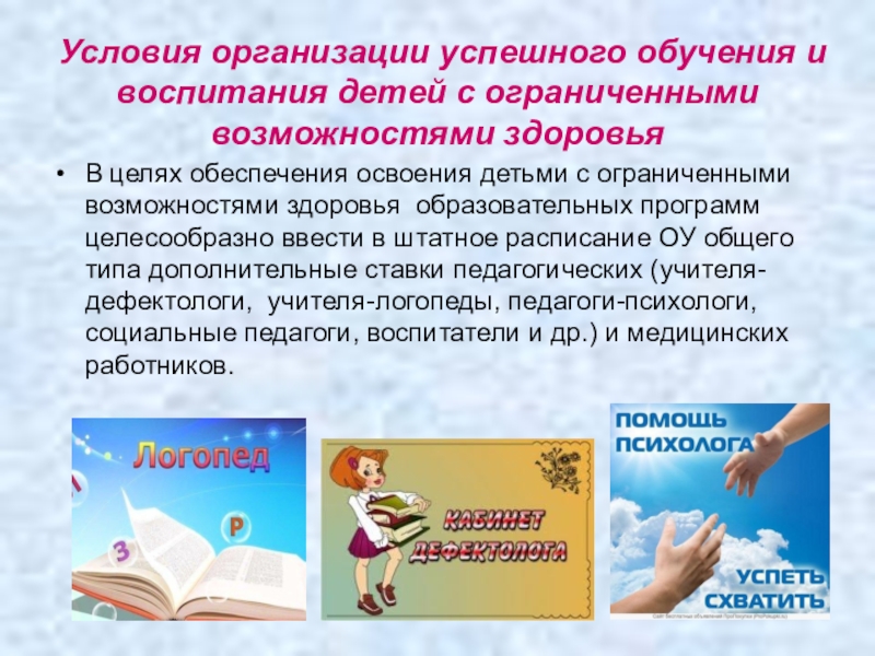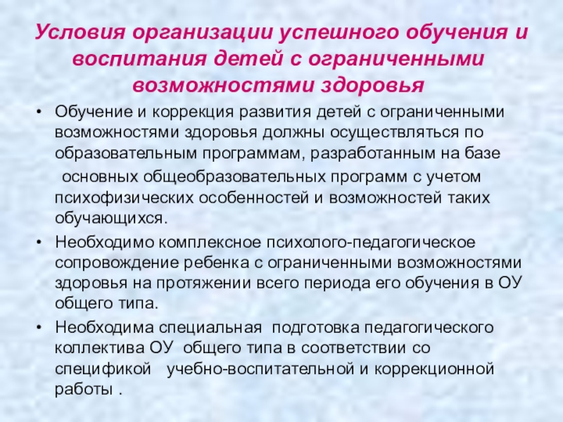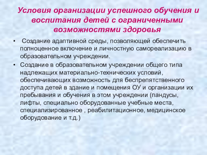 Слайд 21Условия организации успешного обучения и воспитания детей с ограниченными возможностями здоровья