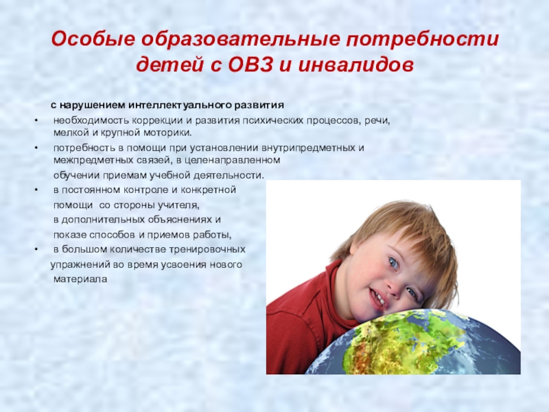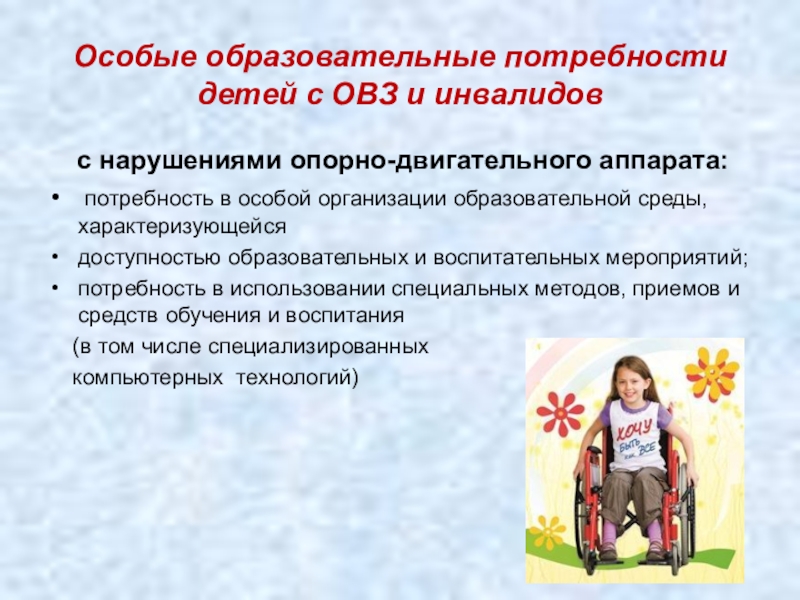 Слайд 16Особые образовательные потребности детей с ОВЗ и инвалидов