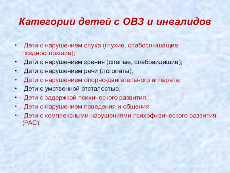 Слайд 11Категории детей с ОВЗ и инвалидов