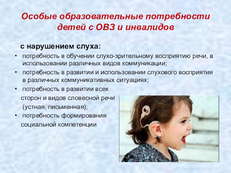 потребность в обучении слухо-зрительному восприятию речи, в использовании различных видов коммуникации;