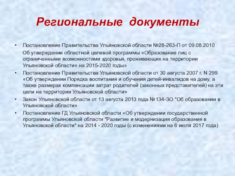 Постановление Правительства Ульяновской области от 30 августа 2007 г. N 299 «Об утверждении Порядка воспитания и обучения детей-инвалидов на дому, а также размерах компенсации затрат родителей (законных представителей) на эти цели на территории Ульяновской области»