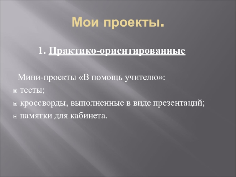 Это сайт презентаций, где можно хранить и обмениваться своими презентациями, докладами, проектами, шаблонами в формате PowerPoint с другими пользователями. Мы помогаем школьникам, студентам, учителям, преподавателям хранить и обмениваться учебными материалами.