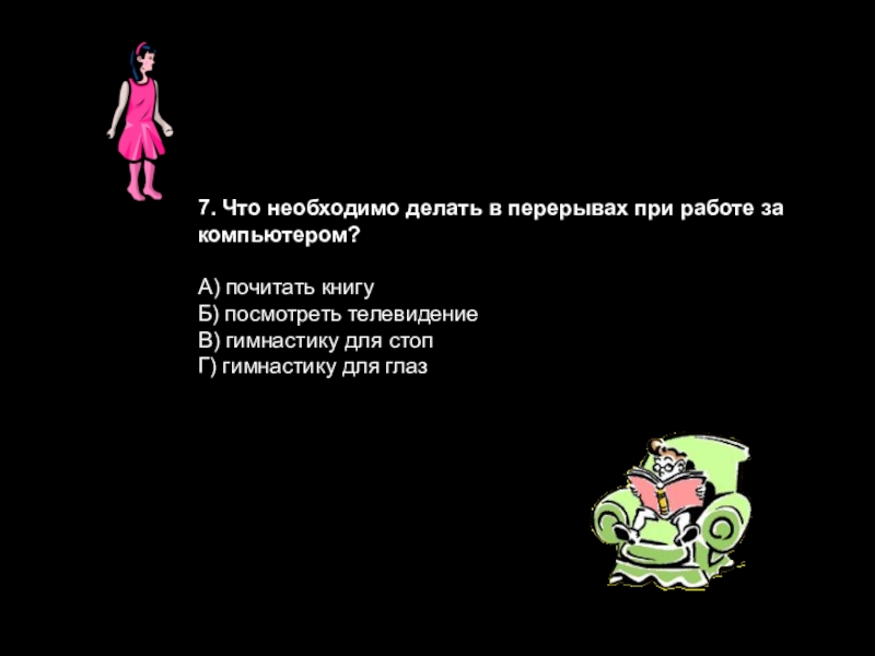 Слайд 507. Что необходимо делать в перерывах при работе за компьютером?